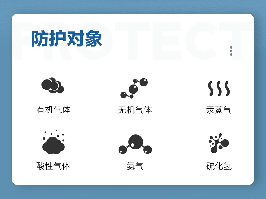 防護(hù)范圍:主要防護(hù)有機(jī)、無機(jī)、酸性氣體或蒸汽、氨及氨的有機(jī)衍生物、硫化氫氣體、汞蒸氣