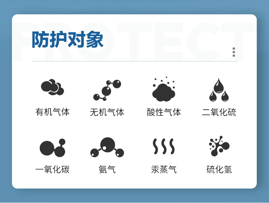 防護(hù)范圍:主要防護(hù)有機(jī)、無機(jī)、酸性氣體或蒸汽、氨及氨的有機(jī)衍生物、硫化氫氣體、汞蒸氣、一氧化碳?xì)怏w